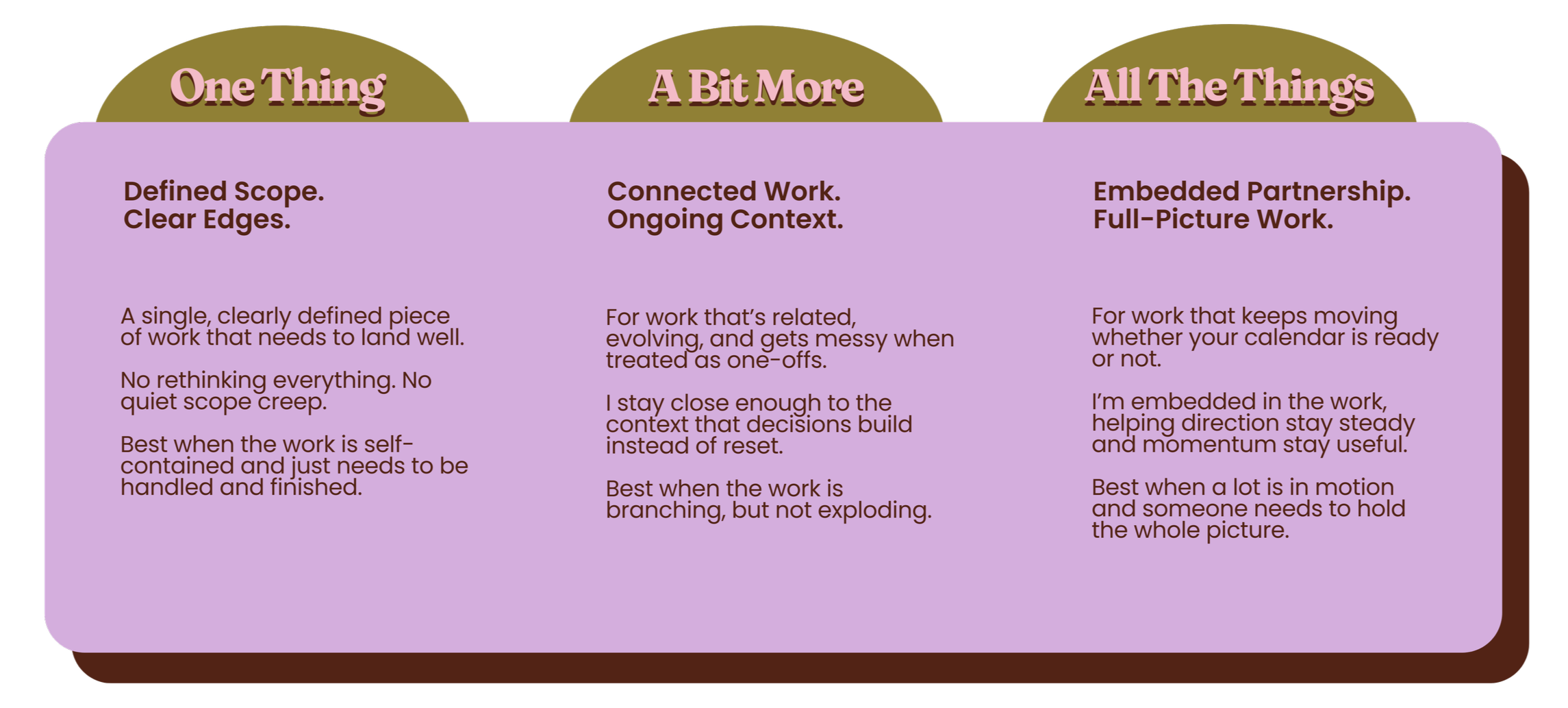 These are the three ways I usually partner with people, depending on how involved the work needs me to be